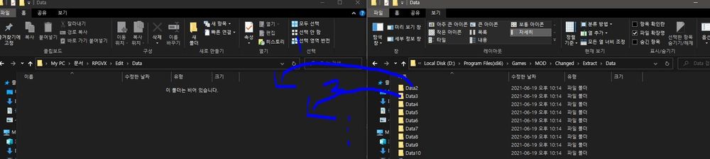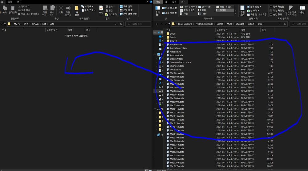 이렇게 프로젝트 데이터 폴더에 파일들만 전부 옮겨서 RPGVX를 열어서 수정, 그 다음 Ctrl + S로 저장한 후 다시 원래 있던 폴더에 옮겨줘.