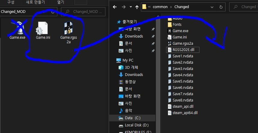 아래 동그라미 친것만 스팀 체인지드 경로에 복사 붙여넣기 해줘. 덮어쓰기 해줘야 해.